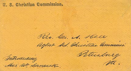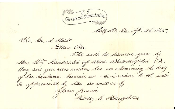 Request within the U.S. Christian Commission, by Henry Heighton to Rev. Hall, to give help to Maggie in obtaining William's body which was buried at Dinwiddie Court House, Virginia